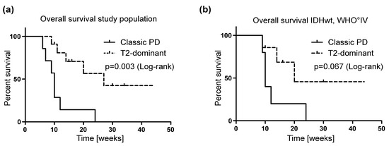 Association of magnetic resonance imaging (MRI) progression patterns with overall survival. Kaplan-Meier survival curves were obtained by discriminating classic progressive disease (PD) in contrast to T2-dominant growth patterns (T2-dominant) in MRI as indicated in the figure. Curves were compared by log-rank (Mantel-Cox) test (p-values depicted). (a) Overall survival for patients with classic PD (n = 7) and T2-dominant growth pattern (n = 11) (median 10 vs. 27 weeks). (b) Overall survival for the subcohort of patients with IDH-wildtype (wt) WHO IV glioblastoma (classic PD n = 5, T2-dominant growth pattern n = 7) (median 10 vs. 20 weeks).