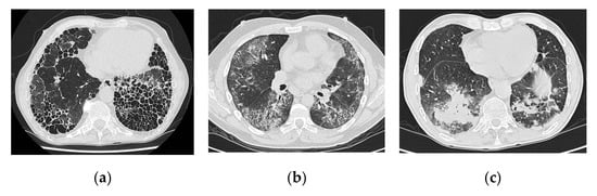 HRCT images showing (a) rheumatoid arthritis-associated usual interstitial pneumonia (RA-UIP), (b) rheumatoid arthritis-associated non-specific interstitial pneumonia (RA-NSIP), and (c) rheumatoid arthritis-associated organizing pneumonia (RA-OP).