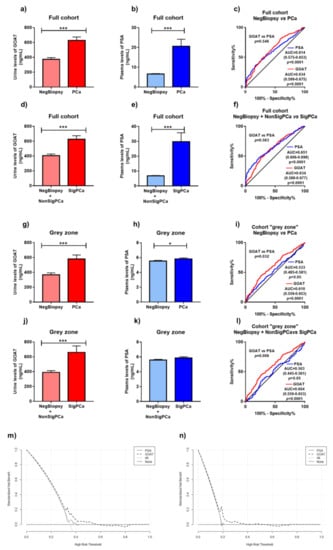 Urine Ghrelin O-Acyl Transferase enzyme (GOAT) and plasma PSA levels according to patient categorization. (a,b) Comparison between urine GOAT (a) and plasma PSA (b) levels in patients with suspect of PCa but with negative results in the biopsy (NegBiopsy; n = 549) and patients diagnosed with PCa (PCa; n = 347). (c) Comparison between the receiver operating characteristic (ROC) curves analyses of the capacity of GOAT (red line) and PSA (blue line) to discriminate among NegBiopsy and PCa patients. (d,e) Comparison of urine GOAT (d) and plasma PSA (e) levels in NegBiopsy patients (n = 549) and patients diagnosed with non-significant PCa (NonSigPCa; n = 143) vs. patients diagnosed with significant PCa (SigPCa; n = 204). (f) Comparison between the ROC curves analyses of the capacity of GOAT (red line) and PSA (blue line) to discriminate among NegBiopsy and NonSigPCa patients vs. PCa patients. (g,h) Comparison between urine GOAT (g) and plasma PSA (h) levels in patients in the grey zone of PSA (range 3–10 ng/mL) with suspect of PCa but with negative result in the biopsy (NegBiopsy; n = 411) and patients in the grey zone of PSA diagnosed with PCa (PCa; n = 225). (i) Comparison between the ROC curves analyses of the capacity of GOAT (red line) and PSA (blue line) to discriminate among NegBiopsy and PCa patients in the grey zone of PSA. (j,k) Comparison of urine GOAT (j) and plasma PSA (k) levels of patients in the grey zone of PSA with NegBiopsy and patients in the PSA grey zone diagnosed with NonSigPCa vs. PCa patients in the PSA grey zone diagnosed with SigPCa (n = 124). (l) Comparison between the ROC curves analyses of the capacity of GOAT (red line) and PSA (blue line) to discriminate among patients in the grey zone of PSA with NegBiopsy and those diagnosed with NonSigPCa vs. patients in the PSA grey zone diagnosed with SigPCa. (m,n) Results of the decision curve analysis. The net benefit for the prediction of PCa (m) and SigPCa (n) on biopsy is shown, by using the different models (GOAT and PSA) as a function of the risk threshold, compared to the benefits of strategies for treating all patients (grey thin line) and treating none (grey thick line). In all cases, data represent mean ± SEM. Asterisks (*, p < 0.05; ***, p < 0.001) indicate values that significantly differ between groups.