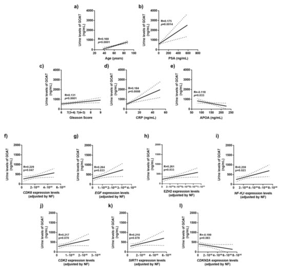 The urine levels of GOAT were positively correlated with age (Figure 2a), PSA levels (Figure 2b), Gleason score (Figure 2c), plasma C-reactive protein (CRP) levels (Figure 2d) and negatively correlated with plasma Apolipoprotein A1 (APOA) levels (Figure 2e) in PCa patients. In addition, GOAT urine levels were also associated to clinical parameters of aggressiveness. Specifically, a positive correlation between urine GOAT levels and the expression levels (in the tumor pieces) of CDK6, EGF, EZH2 and NF-KB was found in patients with PCa (Figure 2f–h). Moreover, CDK2 and SIRT1 expression in the tumor pieces of these patients tended to directly, while CDKN2A inversely, be correlated with GOAT urine levels (Figure 2i–l).