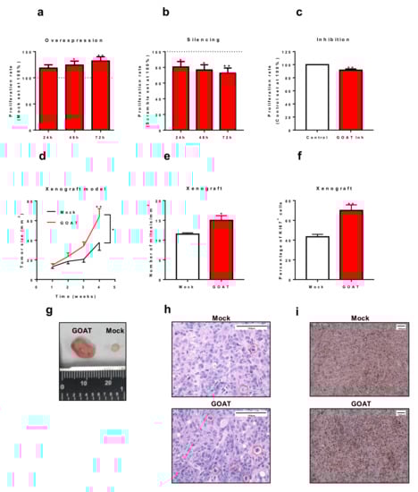 Effects of GOAT in vitro and in vivo. Cell proliferation rate (determined by Alamar-Blue assay) at 24, 48 and/or 72 h in response to GOAT overexpression (a), silencing (b) and pharmacological blockade with the specific GOAT inhibitor GO-CoA-Tat (c). Results are referred as a percentage of the control condition (mock, scramble and vehicle-treated cells, respectively). (d) Comparison between the growth of xenograft tumors derived from mock-transfected cells (black line) and GOAT-overexpressing cells (red line) over time. (e) Number of mitosis per mm2 in the xenograft tumors derived from mock-transfected DU145 cells and GOAT-overexpressing DU145 cells. (f) Percentage of positive KI67 cells in mock and GOAT xenograft tumors. (g) Representative image of tumor size of mock and GOAT xenograft tumors. (h) Representative image of xenograft tumors derived from mock-transfected DU145 cells and GOAT-overexpressing DU145 cells with hematoxylin-eosin staining. (i) Representative images of KI67 staining of xenograft tumors derived from mock-transfected DU145 cells and GOAT-overexpressing DU145 cells. The asterisks (*, p < 0.05; **, p < 0.01) indicate values that significantly differ between groups.