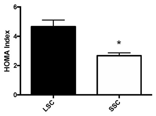 Given the notion that MetS is a hallmark of insulin resistance, we assayed insulin resistance by means of the HOMA index. As shown in Figure 1, the HOMA index was lower in the SSC than in the LSC group (2.67 ± 0.20 vs. 4.66 ± 0.44, respectively; p = 0.0002).