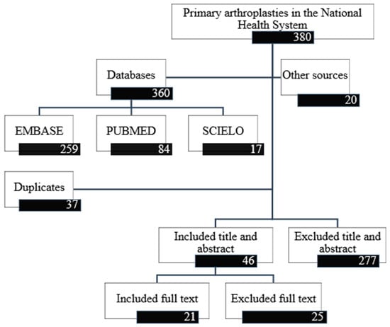 A total of 360 references were identified (259 from EMBASE, 84 from PubMed and 17 from SCIELO) (Figure 1). After eliminating duplicates, 323 were screened by title and abstract. After screening, 277 documents were excluded, thus including 46 for full-text review. Of these 46 references, 25 were excluded and 21 studies were included in the final evidence tables [18,19,20,30,31,32,33,34,35,36,37,38,39,40,41,42,43,44,45,46,47].
