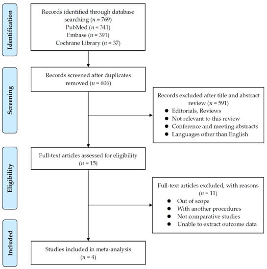 A PRISMA flow diagram summarizing the data is shown in Figure 2. We identified a total of 769 studies, of which 606 remained after removing duplicates. Of 606 articles, 591 articles were removed according to the selection criteria. Thereafter, we analyzed the full text of the remaining 15 articles to ensure that they satisfied the inclusion criteria. Four studies were considered suitable for the current meta-analysis, including two prospective and two retrospective observational studies [,,,]. The data from Freire et al.’s study was a part of Friedlander et al.’s study [,], therefore only one of the two studies were adopted for meta-analysis depending on the purpose.
