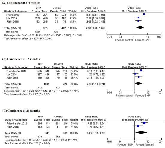 Forest plots for continence at 3–4 months (A), 12 months (B), and 24 months (C) between patients with BNP and those without BNP. BNP, bladder neck preservation; CI, confidence interval.