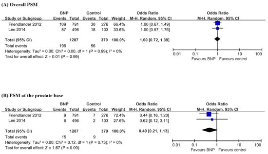 There was no significant difference in the overall PSM outcomes (OR, 1.00; 95% CI, 0.72–1.39; p = 0.99) and PSM outcomes at the prostate base (OR, 0.49; 95% CI, 0.21–1.13; p = 0.09) (Figure 4). Friedlander et al. only reported about biochemical recurrence []. There was no difference in biochemical recurrence-free survival between the two groups (hazard ratio, 1.20; 95% CI, 0.62–2.31; p = 0.596).