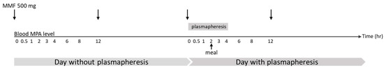Timing of mofetil (MMF) dosage, plasmapheresis sessions, and meal on the day before and on the day with a plasmapheresis session. MPA: mycophenolic acid.