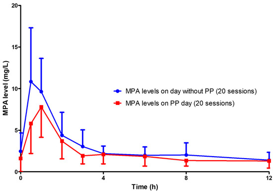 MPA levels on the day with plasmapheresis (20 sessions) compared with those on the day without plasmapheresis (20 sessions). PP: plasmapheresis.