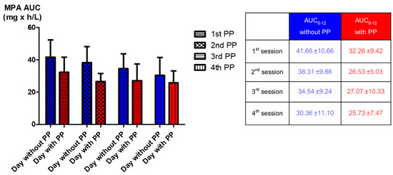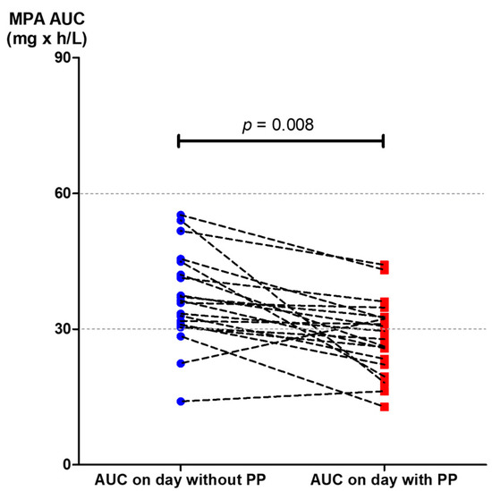 The mean of MPA AUC0–12 of the day with plasmapheresis was significantly lower than that of the day without plasmapheresis (28.22 ± 8.21 vs. 36.79 ± 10.29 mg × h/L, p = 0.001) (Figure 2). The percentage reduction of AUC0–12 was 19.49 ± 24.83% (Table 2). The early part of the AUC was affected by plasmapheresis sessions. The AUC0–4 of the day with plasmapheresis was significantly lower than that of the day without plasmapheresis (15.79 ± 6.46 vs. 21.78 ± 5.66 mg × h/L, p < 0.001), while the AUC4–12 was not significantly different between the day with and that without plasmapheresis (12.43 ± 5.02 vs. 15.00 ± 7.56 mg × h/L, p = 0.125).