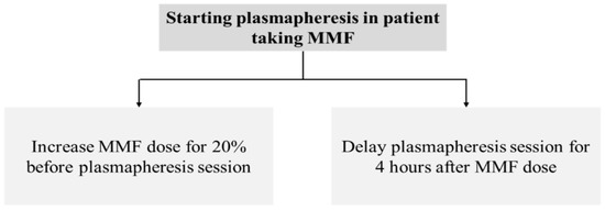 Several immunologically mediated diseases can be treated by MPA together with plasmapheresis, i.e., systemic lupus erythematosus (SLE), lupus nephritis, myasthenia gravis, Guillain–Barré syndrome, psoriatic arthritis, relapsed/refractory thrombotic thrombocytopenic purpura (TTP), severe polymyositis/dermatomyositis, inflammatory bowel disease, pemphigus vulgaris, and kidney transplantation [5,6,7]. Unintentional removal of MPA may result in inadequate immunosuppression and unfavorable outcomes. Of interest, the effect of plasmapheresis on MPA concentration has been studied only in a case series of two patients, one kidney transplant recipient and one patient with myasthenia gravis [8]. MPA removal were measured by considering MPA levels at only two time points—before and after each plasmapheresis session. The MPA removal was calculated on the basis of MPA concentration in plasma effluent. The authors concluded that plasmapheresis of 3 L of plasma did not significantly alter post-plasmapheresis MPA concentration. Currently, there are no available data regarding the effect of plasmapheresis on the area under the concentration–time curve from 0 to 12 h (AUC0–12) of MPA, which is the best indicator of MPA exposure of patients.