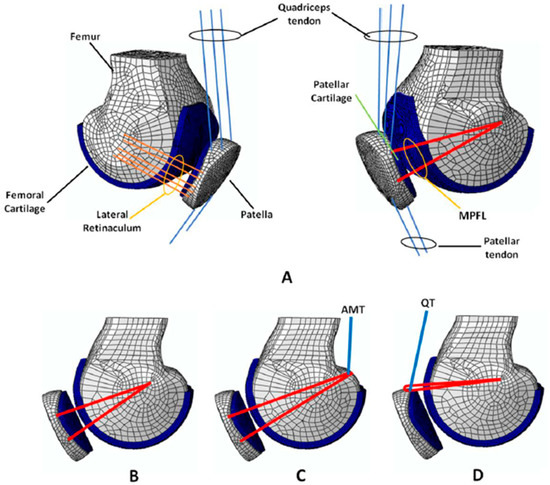 (A) Parametric geometry of the PFJ (femur, patella, and femoral and patella cartilages), (B) static/anatomic reconstruction, (C) dynamic reconstruction using AMT as the femoral fixation, and (D) dynamic reconstruction using the quadriceps tendon (QT) as one of the attachment points.
