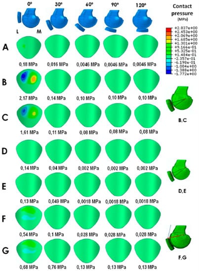 Contact pressure (MPa) on the patellar cartilage: (A) intact knee, (B) anatomic MPFLr with semitendinosus autograft, (C) anatomic MPFLr with gracilis autograft, (D) MPFLr with semitendinosus autograft using the AMT as a pulley, (E) MPFLr with gracilis autograft using the AMT as a pulley, (F) MQTFLr with semitendinosus autograft, and (G) MQTFLr with posterior tibial tendon allograft (M: Medial; L: Lateral).