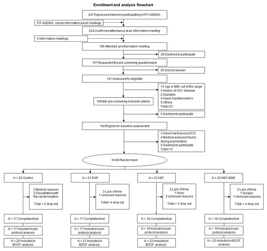 Enrolment and analysis flow-chart. Abbreviations: BMI—body mass index; CDV—cardiovascular disease; ECG—electrocardiogram; PAR—physical activity recommendations for adults’ group; HIIT—high intensity interval training group; HIIT+EMS—HIIT plus whole-body electromyostimulation group; QUICKI—quantitative insulin sensitivity check index; BOCF—baseline observation carried forward imputation.