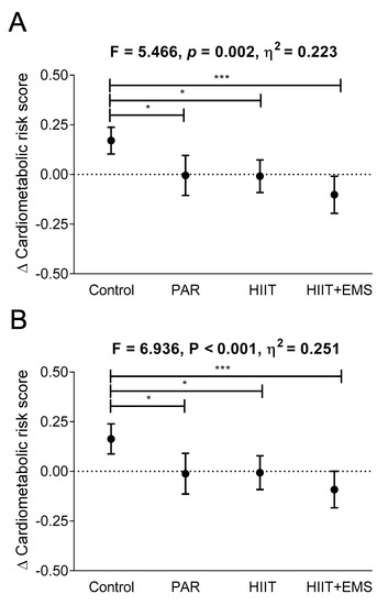 Changes in cardiometabolic risk after the intervention study in the four groups. Analysis of covariance adjusting for baseline values, with post hoc Bonferroni-corrected t-test (Panel A). Sensitivity analysis: baseline-observation carried forward imputation (Panel B). * p < 0.05, *** p < 0.001. The data are shown as means (standard deviation). Abbreviations: PAR—physical activity recommendations group; HIIT—high intensity interval training group; HIIT+EMS—HIIT plus whole-body electromyostimulation group.