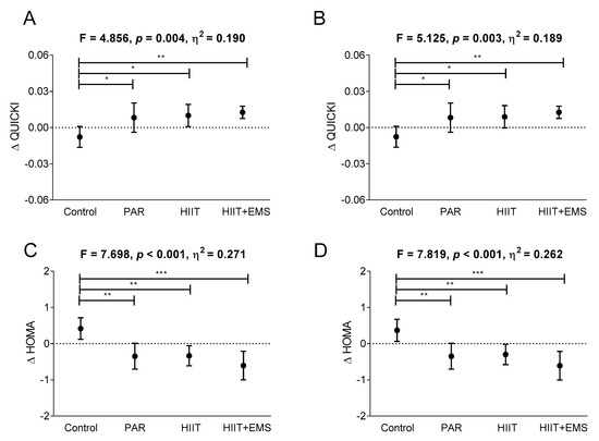 Changes in QUICKI (quantitative insulin sensitivity check index) and HOMA (homeostasis model assessment index) after the intervention study in the four groups. The p value is for ANCOVA adjusting for baseline values, with post hoc Bonferroni-corrected t-test (Panels A and C). Sensitivity analysis: baseline-observation carried forward imputation (Panels B and D). * p < 0.05, ** p < 0.01, *** p < 0.001. The data are shown as means (standard deviation). Abbreviations: PAR—physical activity recommendations group; HIIT—high intensity interval training group; HIIT+EMS—HIIT plus whole-body electromyostimulation group.