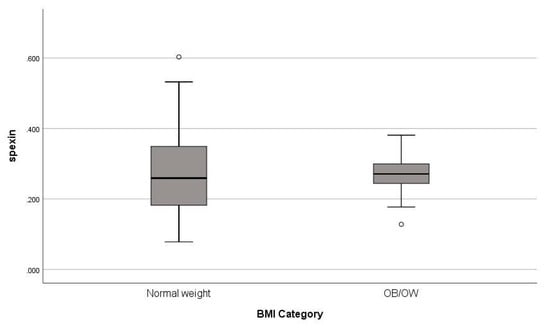 In the absence of effective and safe drugs [], regulation of lipoprotein and androgen status could contribute to atherogenic fraction reduction. In that context, spexin could be further evaluated in future studies as a promising target for novel therapeutic research. As expected, testosterone and SHBG concentrations were significantly lower in the OB/OW group (vs. the NW group). The inverse relationship between obesity and testosterone can be explained by the high levels of the enzyme aromatase in adipocytes, which converts testosterone to estradiol and may therefore lower circulating testosterone []. Serum concentrations of SHBG are also known to be negatively associated with obesity [,]. Interestingly, this study demonstrated for the first time an association between fasting serum spexin concentrations with Lp(a) and androgens.