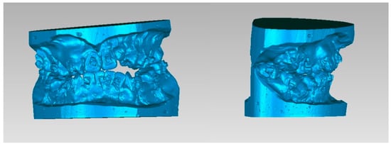 To transfer the dental-cast method into a digital image, the maxillary and mandibular dental casts and the defined surgical occlusion were scanned (Figure 2) by using a surface scanner (3-Shape, Copenhagen, Denmark). Using Dolphin software, the dentition in CBCT was superimposed and replaced by a digitalized dental image [42,43]. The 3D skull models were oriented according to the Frankfort horizontal and midsagittal planes. Osteotomy lines were created by segmenting the maxilla (Le Fort I) and mandible (bilateral sagittal split osteotomy). The digitalized dental image was then manipulated by moving the osteotomized distal mandible segment to the fixed maxilla for achievement of the desired final surgical occlusion (Figure 3, Figure 4 and Figure 5).