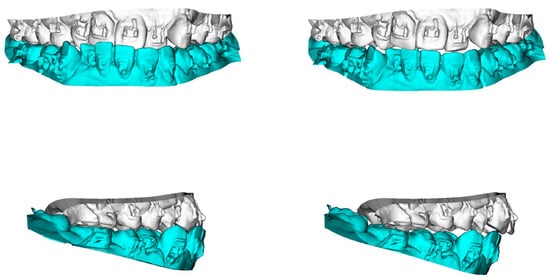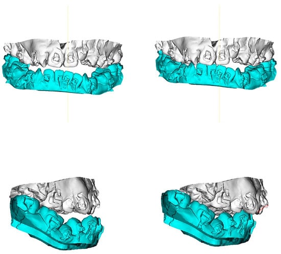 3D maxillary and mandibular dental arch models (left) before and (right) after mobilization of the osteotomized mandible distal segment to achieve final surgical-occlusion setup. Digitalized dental images displayed in Figure 2.