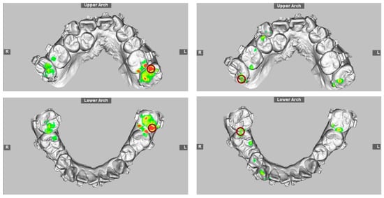 Occlusogram with color map tool displaying 3D (top) maxillary and (bottom) mandibular dental-arch models (left) before and (right) after mandible mobilization for occlusion setup, with surgical occlusal contact on three segments and six teeth. Note the reduction of tooth contact in posterior region (red and green color) due to the creation of anterior-tooth contact (green color), which is a characteristic step adopted for surgical-occlusion setup in surgery-first approach. Red indicates degree of (left) dental collision, which can be (right) thoroughly adjusted before finishing surgical-occlusion setup. For the surgery-first approach, the orthodontic brackets were bonded preoperatively but with no orthodontic tooth movement; wires were placed one day before surgery; tooth #14 was extracted during surgery; orthodontic treatment started during the healing stage by addressing the curve of Spee (a large overjet was designed for the surgery) and the constrict upper posterior teeth with trans-palatal arch appliance. Dental images displayed in Figure 2 and Figure 3.
