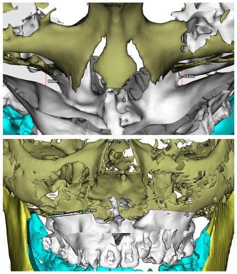 3D imaging views displaying the measurements in medial and lateral maxillary pillars bilaterally which are adopted as guiding template for transferring the 3D planning to actual single-splint technique-based surgical procedure (Figure 9), including (Top) advancement in the antero-posterior direction, yaw rotation, (Bottom) vertical extrusion, and roll rotation.