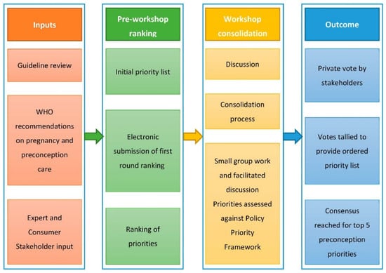 A modified Delphi process and Nominal Group Technique were used to determine the preconception priorities [18,19]. This process has been used previously to establish priorities for data driven healthcare improvement and cancer care and was specifically adapted to address research goals in this context [19]. The multistep process is outlined in Figure 1 and occurred in three phases: inputs, ranking, and output, with the process spanning before, during, and after a workshop held at the HiPPP international forum. The workshop was four hours in duration and was facilitated by HT with the assistance of two early career researchers (BH and CB).