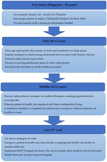 In response, and to mitigate potential adverse health outcomes on these youth, a unique hospital-based pediatric to adult transitional integrative care program was developed and implemented by the Hospital for Sick Children (SickKids) and University Health Network-Toronto General Hospital (UHN-TGH) in 2015. The Adolescent Medicine’s Good 2 Go Transition Program at SickKids partnered with the sleep team to support the development of the Sleep Disorders Pediatric Transition (SlePT) program. The SlePT program incorporated recommended guidelines and design principles [1,58,59]. In the SlePT program, youth with OSA requiring PAP are either obese and/or have an underlying medical condition, the majority are ambulatory, and more than 50% demonstrate the ability to function independently.