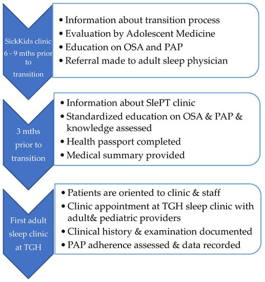 (ii) Sleep clinic 3 months prior to transfer: This visit follows a standardized protocol which begins by (1) the patient and caregiver receiving a brochure for the SlePT clinic. It includes the date, time, and location of the SlePT clinic, an introduction to adult-oriented healthcare, information on the responsibility placed on the patient, and answers to frequently asked questions. (2) The patient and caregiver receive standardized education by the sleep multi-disciplinary team about OSA, PAP treatment, and efficacy as well as adverse health consequences of untreated OSA; (3) teaching around the functioning of their PAP device; (4) a health passport with pertinent details of PAP therapy; (5) a medical summary is provided to the patient outlining their diagnosis and treatment(s); and (6) a final review by pediatric staff is completed. The patient is also reminded that Sick Kids will continue as the primary contact until the patient is seen by the adult sleep physician at UHN-TGH.