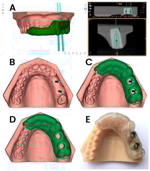 (A–C) Dental implant planning with the computer-aided static navigation system using a cone-beam computed tomography (CBCT) scan (green lines); (C,D) virtual template design according to the planned virtual dental implant placement; (E) manufactured stereolithography template fixed over the dental surface of the teeth and placed over the partially edentulous upper jaw models.