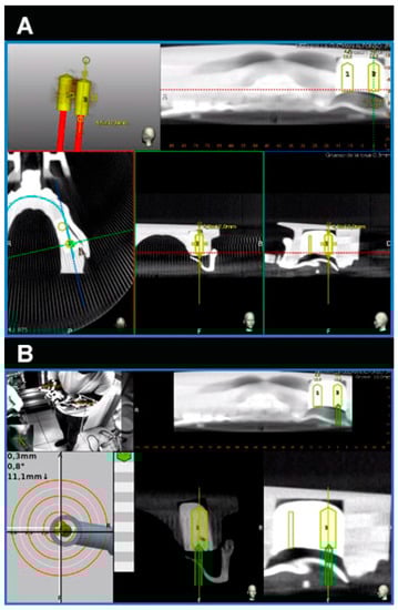 Following the dental implant placement, postoperative CBCT scans were taken. Dental implant planning and postoperative CBCT scans of the study groups were uploaded into 3D implant-planning software (NemoScan, Nemotec, Madrid, Spain) and matched to analyze apical deviation, which was measured at the apical endpoint; coronal deviation, which was measured at the entry point; and angular deviation, which was measured in the center of the cylinder. All noted deviations of all of the implants were evaluated and compared in the axial, sagittal, and coronal views (Figure 3A,B) using the same expertise operator. Results were expressed according to each position.