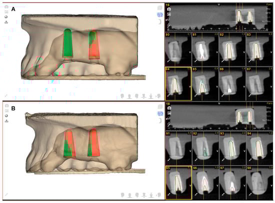 (A) Dental implant planning (green cylinders) and dental implant placement (red cylinders) using the computer-aided static navigation system and (B) the computer-aided dynamic navigation system.