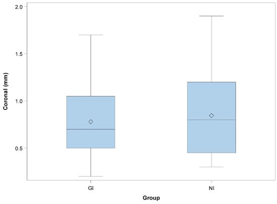 Table 1 shows the mean and SD values. Mean deviations of 0.78 ± 0.43 mm (min: 0.20 mm; max: 1.70 mm) and 0.85 ± 0.48 mm (min: 0.30 mm; max: 1.90 mm) were observed at the coronal entry point of the GI (Figure 3A) and NI (Figure 3B) study groups, respectively (Figure 4).