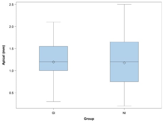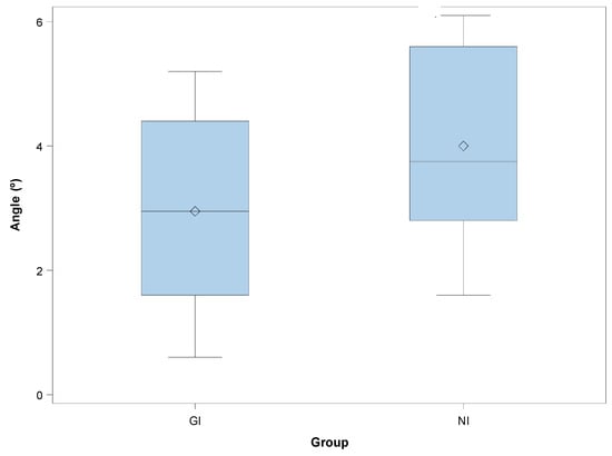 The paired t-test revealed no statistically significant differences between the apical deviations of GI and NI (p = 0.9081). Mean deviations of 2.95° ± 1.48° (min: 0.60°; max: 5.20°) and 4.00° ± 1.41° (min: 1.60°; max: 6.10°) were observed in the GI (Figure 3A) and NI (Figure 3B) study groups, respectively (Figure 6). The paired t-test revealed statistically significant differences between the angular deviations of GI and NI (p = 0.0272).