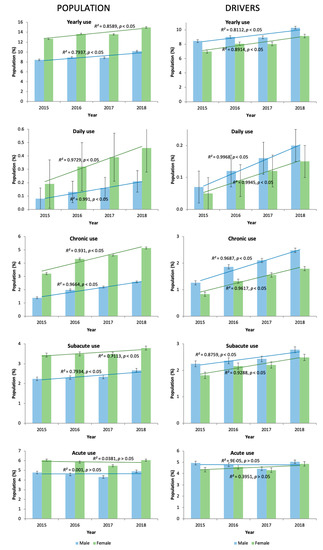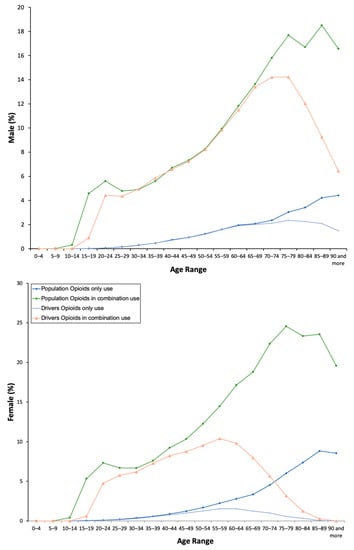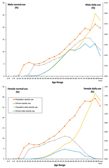 Overall, among drivers, the use of opioid analgesics increased from 2015 to 2018. Nevertheless, figures differed among the driver population: opioid use (8.72%) was higher in men than in women (9.17% versus 8.06, χ2 = 16,871.00, p = 0.001; Table 1). As with the general population, acute use (4.68%) predominates over chronic use (1.7%) and daily use (0.13%) among drivers. Interestingly, the higher percentage of male users in the driver population was not consistent with the DIM use that predominates among women into the general population (2.49 ± 0.02 versus 2.26 ± 0.01, t = −14.15, p = 0.001; Table 1). Importantly, opioid use increased with age, with a peak age range of 70–74 years in the case of male drivers and 55–59 years in the case of female drivers. (Figure 1). There were no other differences between drivers and the general population.