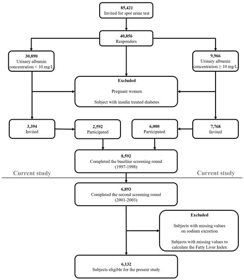 For the present study, we used data of participants who completed the second screening round in the PREVEND study (2001–2003; n = 6893), in which 24 h urine collections are available [22,23]. We excluded all subjects with missing values on urinary sodium excretion and subjects in which clinical and biochemical variables required to calculate the Fatty Liver Index (FLI), a proxy of NAFLD, were not available, leaving 6132 participants (Figure 1).
