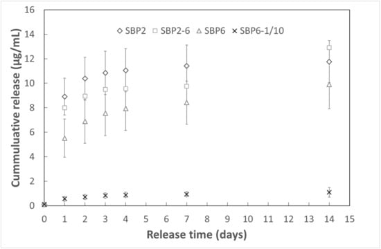 Indeed, bone requires its different cells to be at different stages of proliferation, differentiation and maturation in a multi-layered organised structure to promote successful tissue growth []. Therefore, it is important to tune the peptide release rate such that there is a high early growth, but also reassure stage diversity for the cells. The target release for the peptide bioavailability was 1 μg per cc SBP per day for about one week. Considering that release is a Fickian-based phenomenon [], this should give a cumulated release of about 12–14 μg over 14 days, with a release burst in the first 2 days. As seen in the results, P2 had its highest release rates the two first days and after 14 days was the release of P2 around 11.75–14.01 μg. This confirms that the release was as designed, hence according also to the safety-by-design paradigm, and most relevantly as biologically desired. Hence, with a clinical translational perspective, SBP has a peptide release rate, which is very adequate to sustain robust and fast bone regeneration in critical applications. One must, however, mention that these releases where done in purify water and that one could expect a different profile once placed in an in vivo environment, due to possible interactions with ions and proteins.