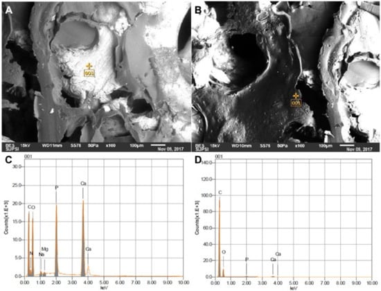 (A) and (B): E/SEM analysis of random point on the internal surface of the grafts. (A) and (C): E/SEM and EDS of bony phase. (B) and (D): E/SEM and EDS of polymeric phase.