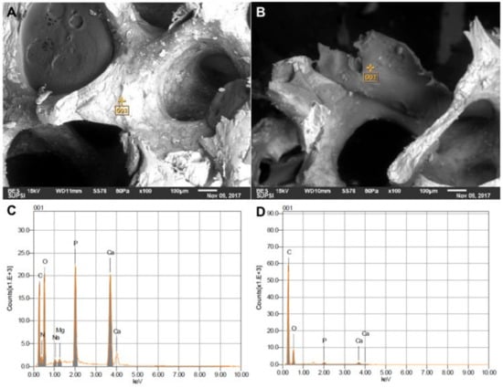 (A) and (B): E/SEM analysis of random point on the external surface of the SmartBonePep® (SBP) grafts. (A) and (C): E/SEM and EDS of bony phase. (B) and (D): E/SEM and EDS of polymeric phase.