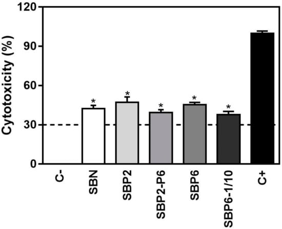 The biocompatibility of the different groups of SBP was first evaluated quantitatively utilizing LDH activity, versus SBN and positive (C+) and negative (C-) controls (Figure 4). The LDH assay detects the amount of LDH that leaks out through the plasma membrane of damaged cells, as a marker of cytotoxicity. As it can be observed in Figure 4, after 72 h of cell culture, all SBP groups had significantly higher toxicity than low control after 3 days of incubation, and cytotoxicity values were over 30%, which is the maximum value accepted for cytotoxicity of medical devices according to current ISO-10993:5, although often considered debatable as this test is not always reliable.