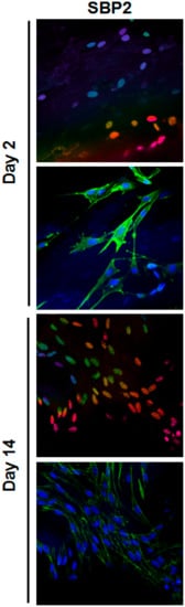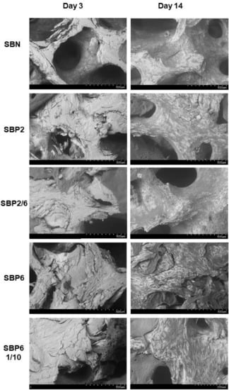 Indeed, afterwards cells grew well onto and inside the scaffolds as observed by E/SEM imaging (Figure 5) and confocal images (Figure 6). Exemplificative pictures are presented in Figure 5, taken after 3 and 14 days in culture, respectively; considerable morphological changes of the seeded cells on the surface of the graft can be observed overtime. After three days, the cells are barely observable on the graft surface, however after 14 days there has been excellent cell growth for all groups, and particularly for SBP2 and SBP6, with widely spreading cells in different layers.