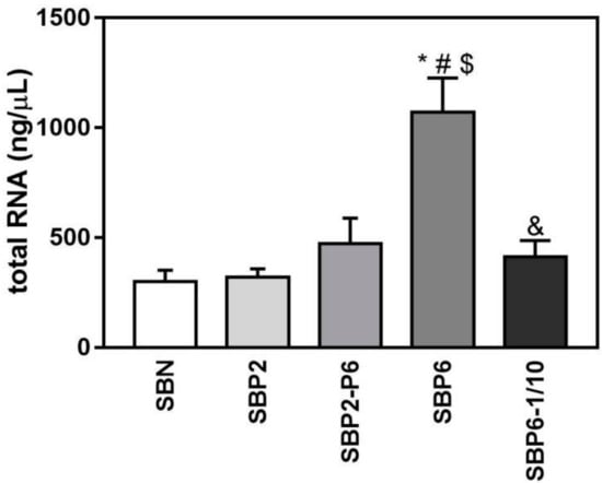 Total RNA extracted from the cells seeded on all SBP samples at 14 days of cell culture, versus SBN. Values represent mean ± SEM. One-way ANOVA and DMS post hoc analyses were performed: * p < 0.05 vs. SBN, # vs. SBP2, $ vs. SBP2-P6, and vs. SBP6.