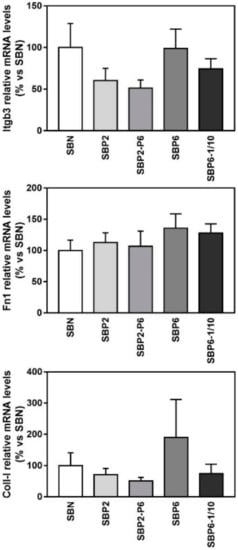 Relative mRNA levels of Integrin beta 3 (Itgb3), Fibronectin 1 (Fn1) and Collagen type 1 (Coll-I) in MC3T3-E1 cells cultured on seeded on all SBP samples at 14 days of cell culture, versus SBN. Data represent fold changes of target genes normalized with reference genes (rRNA 18 S and Gapdh), expressed as a percentage of cells seeded on SBN, which were set to 100%. Values represent mean ± SEM. One-way ANOVA and post hoc analyses were performed. No significant differences were found.