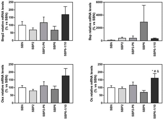 Relative mRNA levels of Bone morphogenetic protein 2 (Bmp2), Bone sialoprotein (Bsp), Osterix (Osx), and Osteocalcin (Oc) in MC3T3-E1 cells cultured on seeded on all SBP samples at 14 days of cell culture, versus SBN. Data represent fold changes of target genes normalized with reference genes (rRNA 18 S and Gapdh), expressed as a percentage of cells seeded on SBN, which were set to 100%. Values represent mean ± SEM. One-way ANOVA and DMS post hoc analyses were performed: * p < 0.05 vs. SBN, # vs. SBP2, and vs. SBP6.