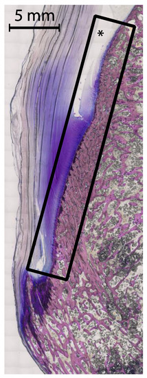 Figure 3. Example of a calcified zone. Thin ground section of the calcaneal tuberosity, the calcaneal tendon and the calcaneal bursa—also a frequent location of bone erosions. The described calcified zone as subchondral and enthesial calcified bone with adjacent underlying trabecular structures including the overlying tissues is marked by the rectangle. The asterix marks the calcaneal bursa. A 5 mm scale is included, the tissue was stained with Giemsa.