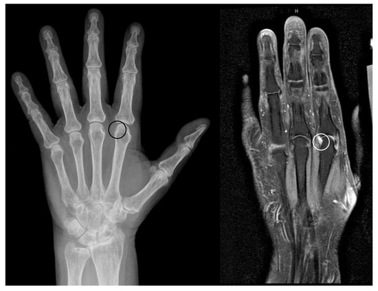 56. Robertson, P.L.; Page, P.J.; McColl, G.J. Inflammatory arthritis-like and other MR findings in wrists of asymptomatic subjects. Skelet. Radiol. 2006, 35, 754–764. [Google Scholar] [CrossRef]