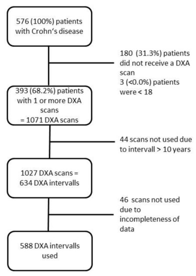 In total, 576 individual CD patients visited the IBD outpatient clinic between 1 June 2014 and 30 June 2017. Among these, 160 patients underwent only a single BMD measurement, while 180 patients did not undergo any DXA scan mainly due to receiving only a second opinion for the treatment of CD. Three patients were excluded due to minor age. Thus, 393 patients who underwent at least one DXA scan at the IBD outpatient clinic were included in the study. Figure 1 shows a flow diagram of patient inclusion and exclusion.