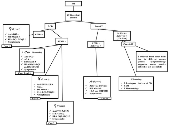 Twenty of the 445 cases with discordant serology results. CD: celiac disease; SIB: Small intestinal biopsy; EMA: Anti-endomysium antibodies; Anti-TG2: Anti-tissue transglutaminase antibodies; HLA: Human leukocyte antigen; ULN: Upper limit of normal; DM: Diabetes mellitus.