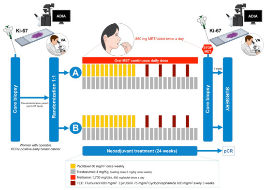 Here, we sought to clarify whether the anti-diabetic biguanide metformin might be employed as a safe candidate to diminish the proliferative potential of residual BC disease after neoadjuvant therapy even if pCR is not achieved. We undertook a prospective analysis involving a well-characterized intention-to-treat (ITT) cohort of the (Metformin and Trastuzumab in Neoadjuvancy) METTEN study, a randomized multicenter phase II clinical trial for patients with HER2-positive BC receiving either metformin combined with anthracycline/taxane-based chemotherapy and trastuzumab (arm A), or an equivalent regimen without metformin (arm B), before surgery [14,15,16]. We first evaluated the function of a pre-therapeutic Ki67 labeling index as a predictive marker for pCR after adding neoadjuvant metformin. We then assessed the effect of adding metformin on the change of Ki67 on sequential core biopsies in patients with residual disease after neoadjuvant treatment. Considering the open debate regarding the reproducibility of Ki67 scoring by visual analysis (VA) in multicenter settings [17,18,19,20,21], we centrally re-evaluated Ki67 using VA and an (Food and Drug Administration) FDA-cleared Ki67 automated digital image analysis (ADIA) algorithm simultaneously. Here we present preliminary evidence highlighting the clinical potential of metformin as a safe candidate to prevent and/or treat the proliferative potential of residual BC disease after neoadjuvant therapy.