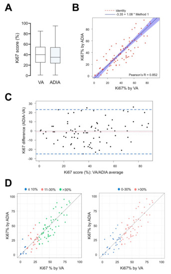 An FDA-cleared Ki67 image analysis algorithm was employed for determining Ki67. First, all of the stained slides were scanned into digital images using the VENTANA iScan System Version 1.0 (Ventana Medical Systems, Inc., Sunnyvale, CA, USA). Then, the VENTANA Companion Algorithm Ki67 (30-9) image analysis application was employed with the VENTANA iScan Coreo Au scanner running the Virtuoso Digital Pathology Image Analysis software. The same breast pathologist who evaluated Ki67 scores by VA selected the regions of interest for ADIA-based Ki67 scoring, taking into consideration confounding factors of digital scoring such as intratumor heterogeneity, presence of intermixed inflammatory cells, carcinoma in situ, or the occurrence of other non-cancer proliferating cells.