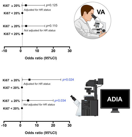 Because the clinically relevant Ki67 cut-off is 20% as defined by the St. Gallen criteria [22], we applied this cut-off to investigate the association between Ki67 expression, treatment arm, and pCR (Supplementary Table S1). In bivariate analysis, we observed the predictive capacity of baseline ADIA-based Ki67 ≥20% to significantly associate with the probability of achieving pCR (OR = 4.76, 95% CI = 1.13–20.09, p = 0.034; Figure 3). The direction and/or intensity of the predictive relationship between baseline ADIA-based Ki67 ≥20% and pCR occurred independently of the treatment arm (Supplementary Tables S1–S3). After additional adjustment for potential confounding characteristics such as the hormone receptor status, the relationship between baseline ADIA-based Ki67 ≥20% and the ability of neoadjuvant trastuzumab-based chemotherapy to achieve a pCR in patients remained significant (OR = 5.57, 95% CI = 1.26–24.74, p = 0.024; Figure 3; Supplementary Tables S4–S6). We failed to observe such predictive capacities of Ki67 ≥20% when Ki67 scoring was stratified using the VA values (Figure 3; Supplementary Tables S1 and S4).