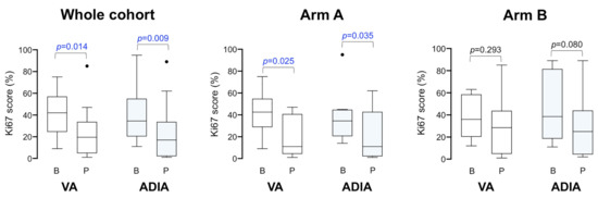 We analyzed the decrease (or lack of decrease) in the percentage of Ki67-positive cancer cells between paired samples of core biopsies samples at baseline and approximately one week before surgery obtained from non-pCR patients in whom both VA and ADIA-based Ki67 scoring was available. The median baseline Ki67 level in this population (n = 14) was 42% (VA)/34.5% (ADIA) before neoadjuvant trastuzumab-based chemotherapy, which significantly decreased to a median of 19.5% (VA; p = 0.014)/17.0% (ADIA; p = 0.009) after treatment (Figure 4). To determine whether the addition of metformin significantly impacted Ki67 expression during neoadjuvant trastuzumab-based chemotherapy, we re-evaluated the relative change in Ki67 scoring from baseline to end-point treatment in non-pCR patients (Figure 4). The Ki67 decreases were largest in the metformin-containing arm A (n = 8), from 42.5% (VA)/34.5% (ADIA) at baseline to 11% (VA; p = 0.025)/11% (ADIA; p = 0.035) at surgery (Figure 4). Conversely, no significant differences were observed in the control treatment arm B (n = 6), in which Ki67 decreased from 36.0% (VA)/38.5% (ADIA) at baseline to 28.5% (VA; p = 0.293)/25.0% (ADIA; p = 0.080).